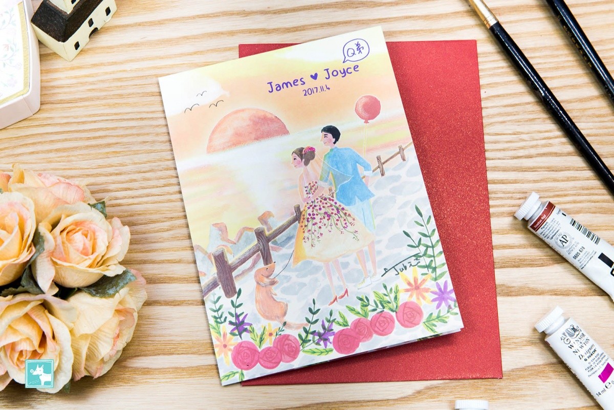 這對可愛新人的主題非常特別,傳統上在婚禮的設計上不太用夕陽落日, 但是他們選了南寮魚港的夕陽當主題,反而格外特別閒適愜意。搭配著他們可愛的狗狗Q弟,穿著俏麗婚紗的新娘,畫著畫著覺得有一種歲月靜好的感覺,暖上心頭!而且喜帖當成背板也非常吸引人,婚禮過後,新人還將背板搬回家貼在牆上裝飾喔!