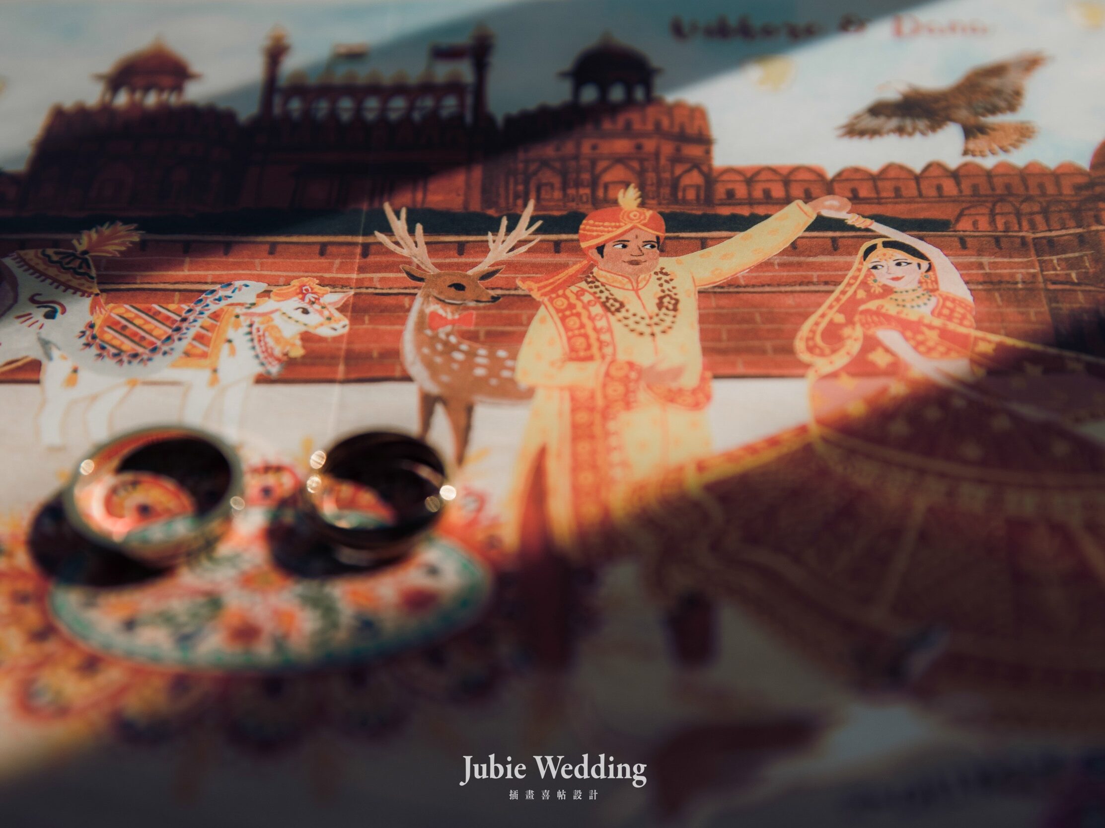 從超美麗的印度飾品、服裝、裝扮到圖騰、小動物和建築,我們用心描繪每個小細節,將喜帖變成迷你繪本,讓你每一眼都能發現驚喜,加上高飽和度的斑斕色彩,成功刻畫出幸福歡慶的印度風情。